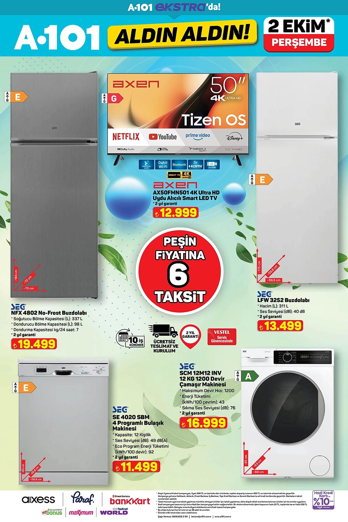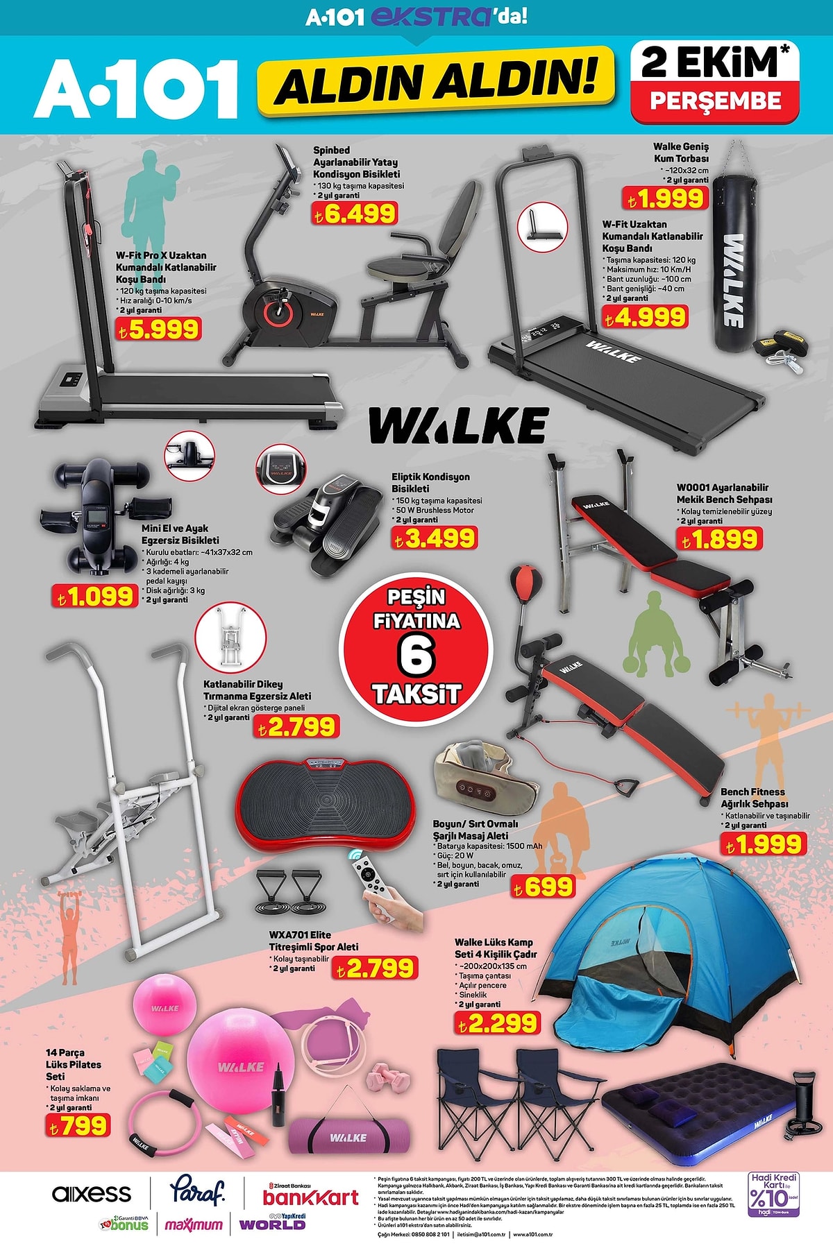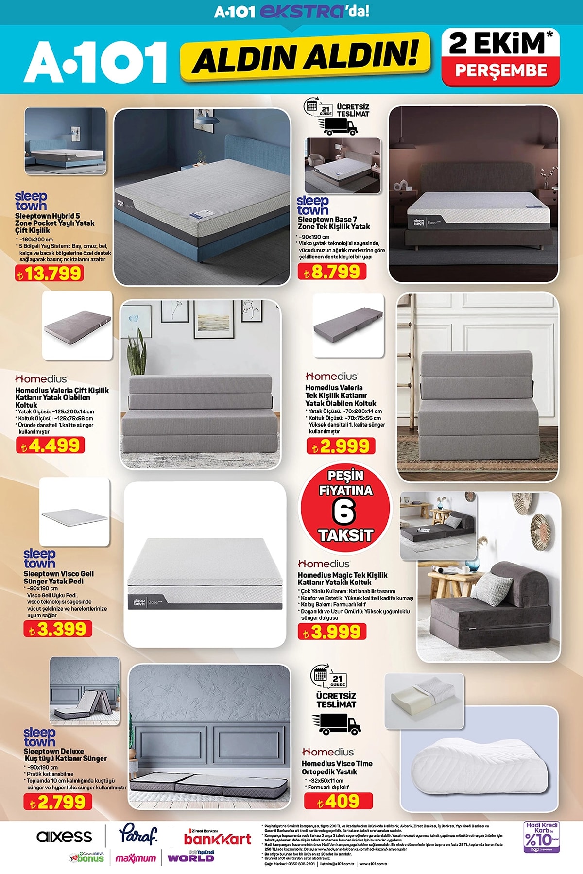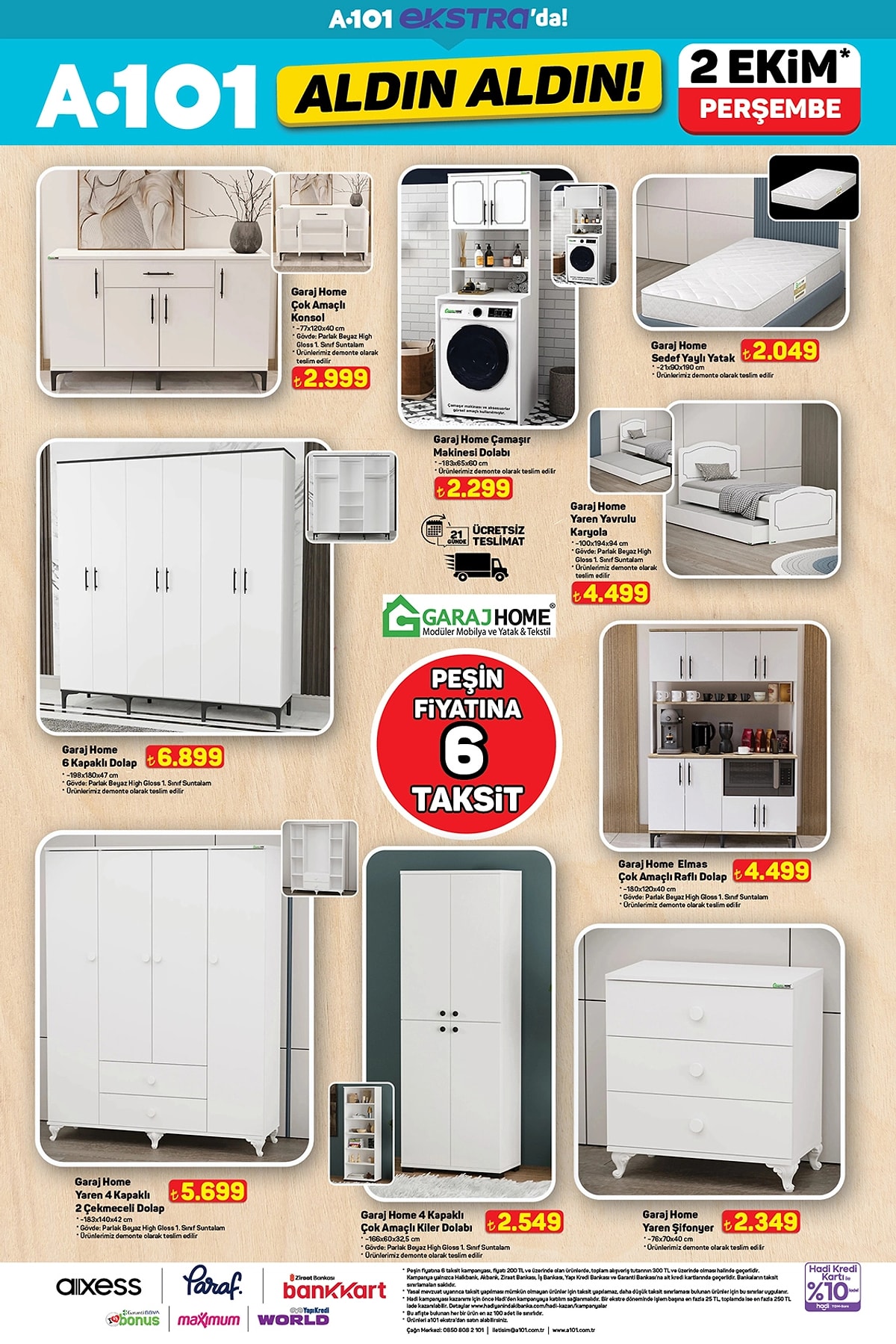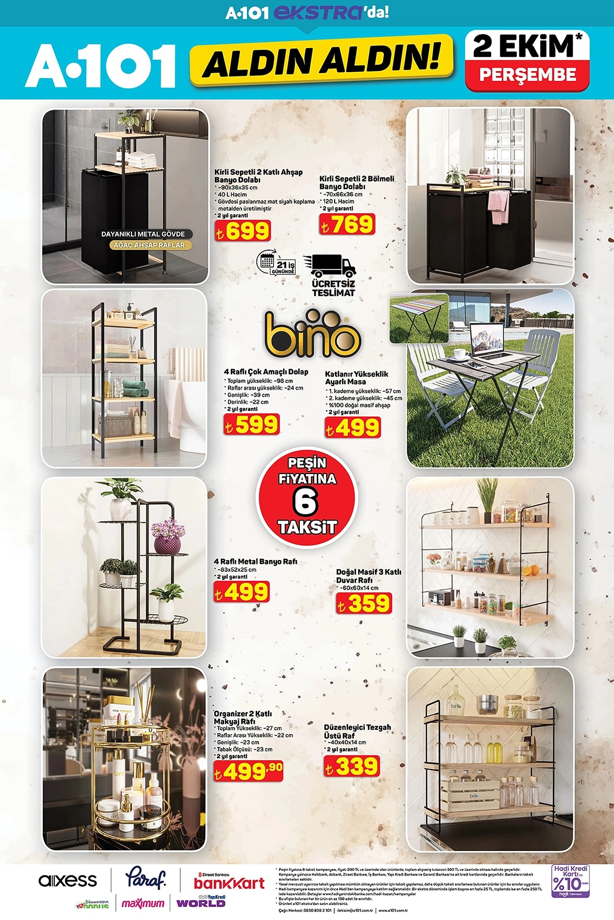 Türkiye’nin en yaygın market zincirlerinden A101, 2 Ekim 2025 Perşembe günü itibarıyla geçerli olacak yeni “Aldın Aldın” kataloğunu yayımladı. Bu hafta spor ekipmanlarından mobilyaya, küçük ev aletlerinden teknoloji ürünlerine kadar yüzlerce üründe cazip fiyatlar ve peşin fiyatına 6 taksit avantajı dikkat çekiyor.