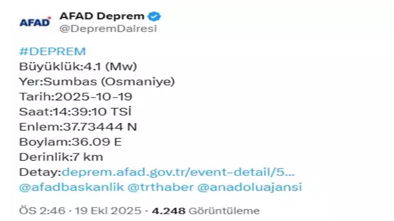 Osmaniye’de bugün saat 14.39 sularında meydana gelen depremle ilgili AFAD’dan son dakika açıklaması geldi. AFAD’ın resmi internet sitesinde yer alan bilgilerde depremin büyüklüğü 4.1 olarak kaydedildi. 19 Ekim 2025 Pazar (bugün) meydana gelen sarsıntı çevre illerden de hissedilirken sarsıntının yerin 7 kilometre derinliğinde meydana geldiği kaydedildi. Depremi hisseden çevre illerdeki vatandaşlar da büyük korku ve panik yaşadı. Depremle ilgili aktarılan son dakika bilgisinde sarsıntı sonrası herhangi bir olumsuz ihbar gelmediği de yer aldı.
