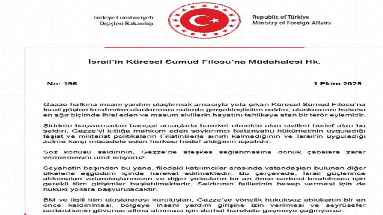 İsrail ordusunun Sumud Filosu’na yaptığı müdahaleye Türkiye’den de ilk tepki geldi. Türkiye Cumhuriyeti Dışişleri Bakanlığı’ndan yapılan açıklamada İsrail’e tepki gösterilirken, BM ve ilgili tüm uluslararası kuruluşlara çağrı yapılarak Gazze’ye yönelik hukuksuz ablukanın bir an önce kaldırılması çağrısında bulundu. Dışişleri Bakanlığı’ndan yapılan yazılı açıklama şu şekilde;