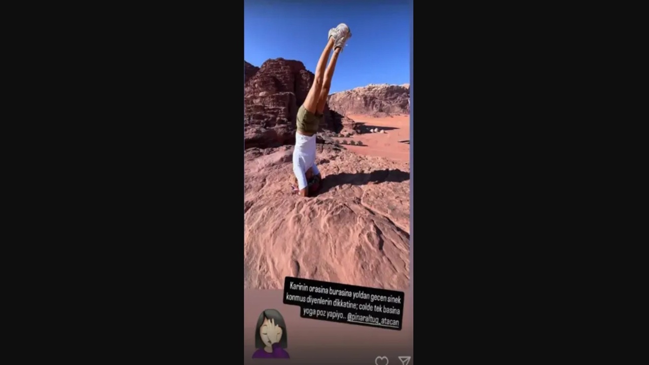 Tartışmaların ardından sessizliğini bozan Yağmur Atacan, eşiyle ilgili eleştirilere mizahi bir dille gönderme yaptı. Sosyal medya hesabından Pınar Altuğ’un çölde tek başına amuda kalktığı fotoğrafı paylaşan Atacan, “Karının orasına burasına sinek konmuş diyenlerin dikkatine” notunu düştü.