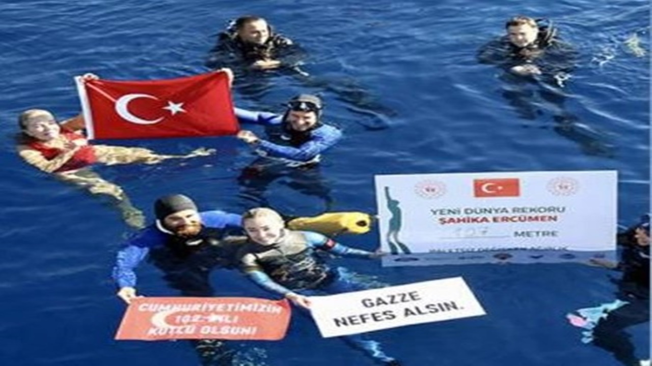 Serbest Dalış Milli sporcumuz Şahika Ercümen, bu kez de Gazze halkına dayanışma mesajı için rekorunu kırdı. Gazze için kendi dünya rekorunu kıran Şahika Ercümen, 107 metreye daldı ve kendi rekorunu geliştirdi. Milli sporcu sudan çıktıktan hemen sonra Tür ve Filistin bayrakları açılması da dikkat çekti.