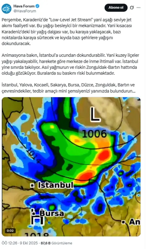 Hava Forum tarafından yapılan değerlendirmede, “Karadeniz üzerinde aktif bir jet akımı var. Bu akım, kıyıya yakın bölgelerde yağışı besliyor. İstanbul’un kuzey ilçeleri bu sistemin etki alanında. Zamanla yağış merkez ilçelere de ilerleyebilir” ifadelerine yer verildi. Açıklamada, Zonguldak ve Bartın hattında daha yoğun yağış ve su baskını riski bulunduğu belirtildi.