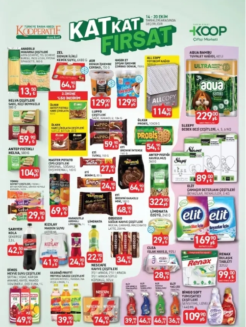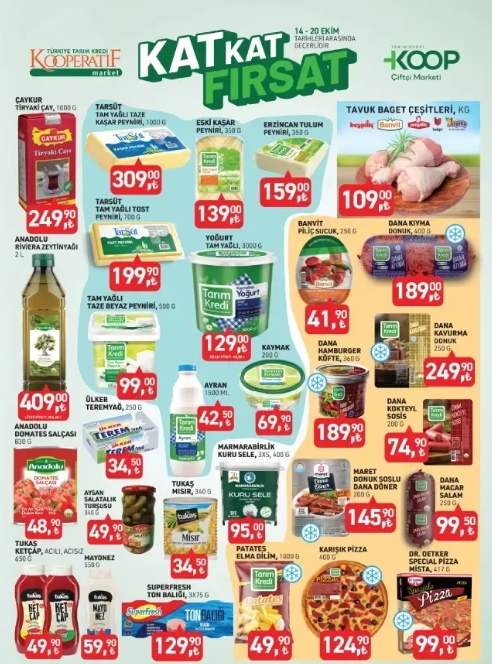 Tarım Kredi Kooperatif Market’in 14-20 Ekim 2025 tarihleri arasındaki “Kat Kat Fırsat” kampanyası, stoklarla sınırlı olarak ülke genelindeki tüm Tarım Kredi Market şubelerinde geçerli olacak.